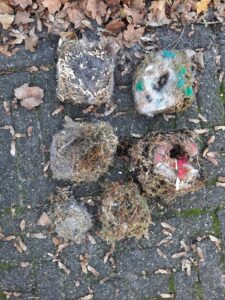 Van de 10 kasjes zijn uit 6 de nestjes verwijderd. In één van kastjes lagen zelfs nog eitjes van de pimpelmees.